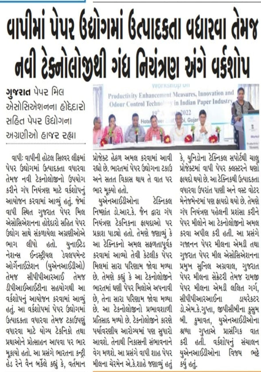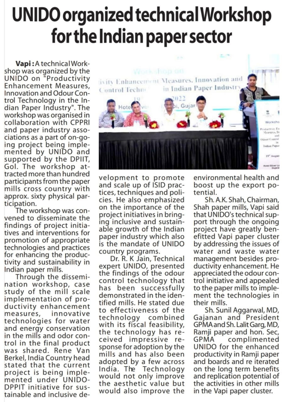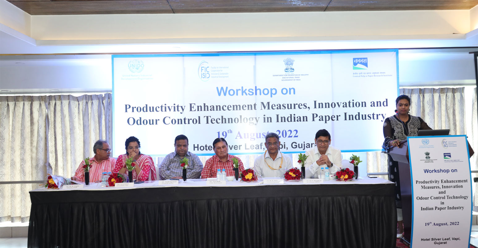 19 August 2022; Vapi, Gujarat: To enhance productivity and innovation and explore ways to control odour in the Indian paper industry, a workshop was organized as part of a DPIIT-UNIDO project on Firm-level demonstration of technologies and productivity enhancement for the pulp and paper industry. The workshop, organized in collaboration with Central Pulp and Paper Research Institute (CPPRI), also shared findings from the project interventions for promotion of appropriate technologies and practices for enhancing the sustainability and productivity in Indian paper mills.