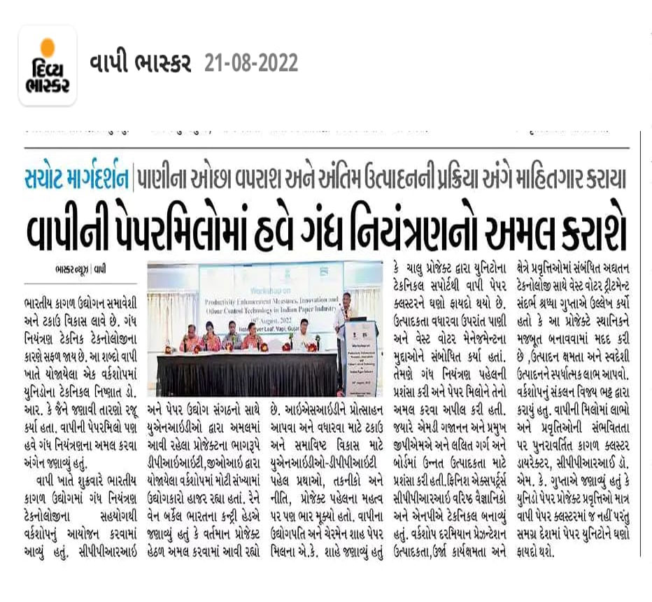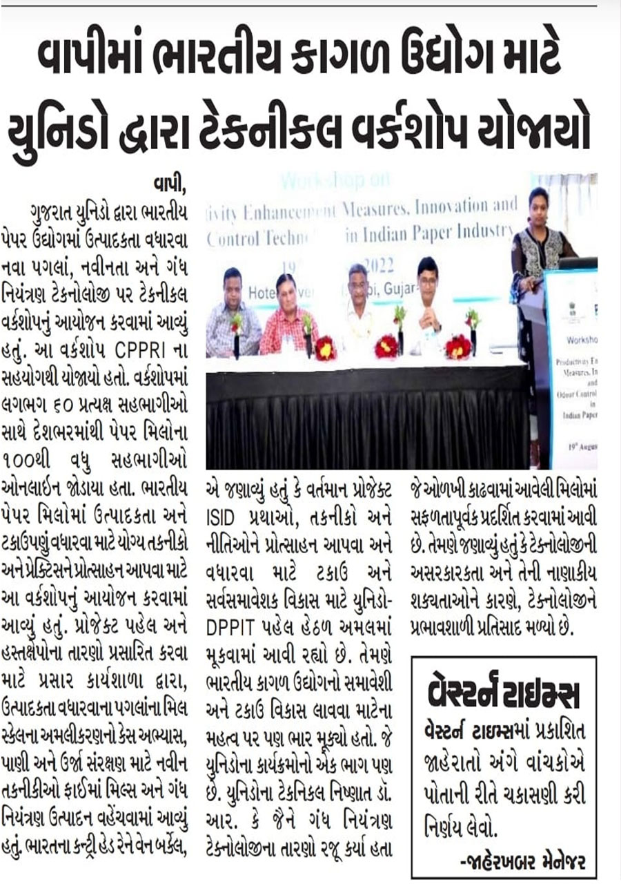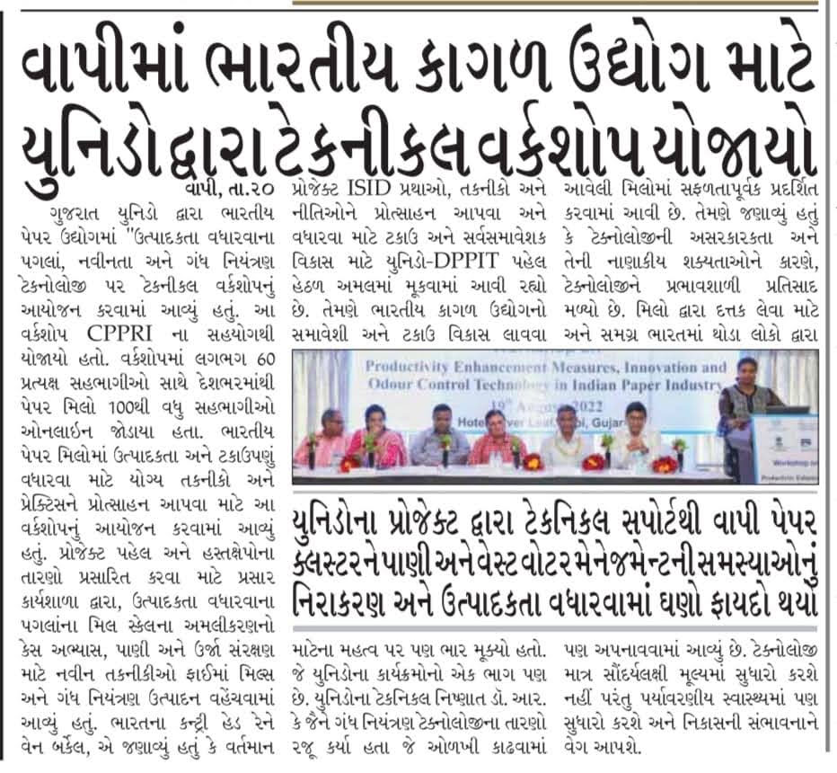 19 August 2022; Vapi, Gujarat: To enhance productivity and innovation and explore ways to control odour in the Indian paper industry, a workshop was organized as part of a DPIIT-UNIDO project on Firm-level demonstration of technologies and productivity enhancement for the pulp and paper industry. The workshop, organized in collaboration with Central Pulp and Paper Research Institute (CPPRI), also shared findings from the project interventions for promotion of appropriate technologies and practices for enhancing the sustainability and productivity in Indian paper mills.
