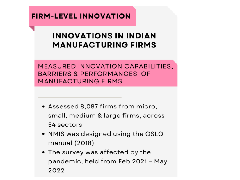 The findings of the “National Manufacturing Innovation Survey (NMIS) 2021-22”, a joint initiative of the Department of Science and Technology and UNIDO, were released on April 27, 2023.