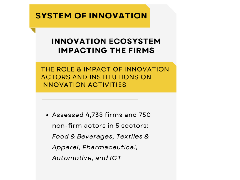 The Sectorial System of Innovation (SSI) survey mapped the manufacturing innovation system and its enabling role in achieving innovations in firms. The SSI study measured the interactions between stakeholders of the innovation ecosystem, relative barriers to innovation, as well as the convergence or divergence of current policy instruments in five key manufacturing sectors.