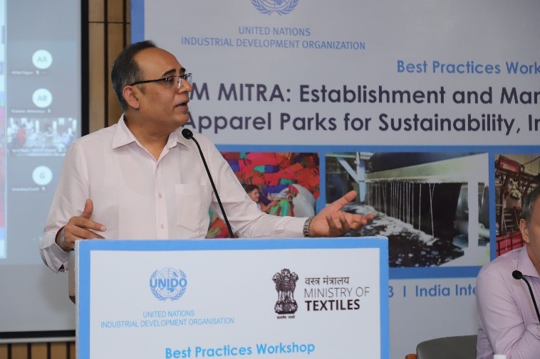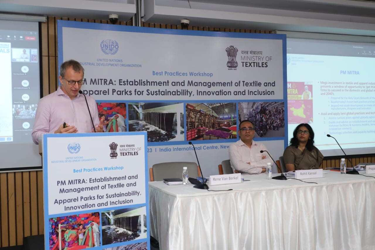 The Ministry of Textiles and the United Nations Industrial Development Organization (UNIDO) conducted a best practices workshop on achieving sustainability, innovation and inclusion in PM MITRA parks in New Delhi on 11 July 2023 in hybrid mode. The participants included officials from Central governments and the designated PM MITRA host states (Gujarat, Karnataka, Madhya Pradesh, Maharashtra, Tamil Nadu, Telangana and Uttar Pradesh), knowledge-partners and representatives of the textile and apparel industry.